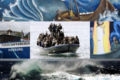 Zuerst in den Blick fallen vier Arme auf, dunkle und helle, die eine Kugel halten. Die Erde vermuten wir, aber sie ist nicht blau, wie sie aus dem Weltall erscheint. Sie hat Flecken, dunkle Flecken und sie schwebt – von den Händen gehalten über einer Suppe oder Fläche von unnatürlicher Farbe. Die Fläche scheint zu wabern, einige Wörter sind sichtbar. Die Farbe macht Angst, wird die Kugel eventuell in diesen Sumpf kippen? Das Bild trägt den Titel: „Was uns heilig ist“. Es ist meine Welt, es ist deine Welt, es ist unsere Welt, die da gehalten wird. Sie muss uns heilig- heil sein.